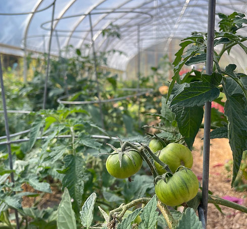 Left: Tomatoes grow on a vine in the farm’s greenhouse. Students picked plants as one of their tasks during the day of volunteering. (Photo by Caroline Grass/Ithaca Week)